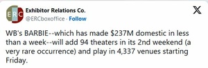 Good news for the weekend, Barbie is adding more screens. I'm thinking at least $90m second weekend. If it can somehow reach $100m it will be just the 7th $100m second weekend and the first for a movie that opened under $200 it's first weekend.