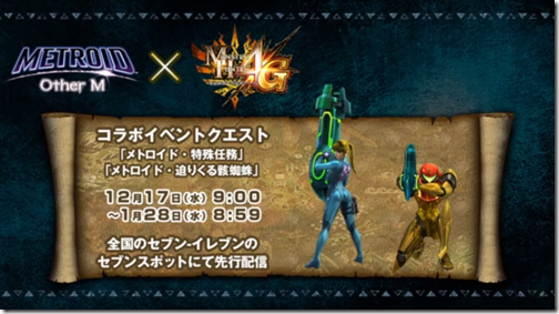 Similar to the other collaborations, the one with Metroid: Other M will feature quests that will allow you to gather materials to make Samus’ Varia Suit and Zero Suit.